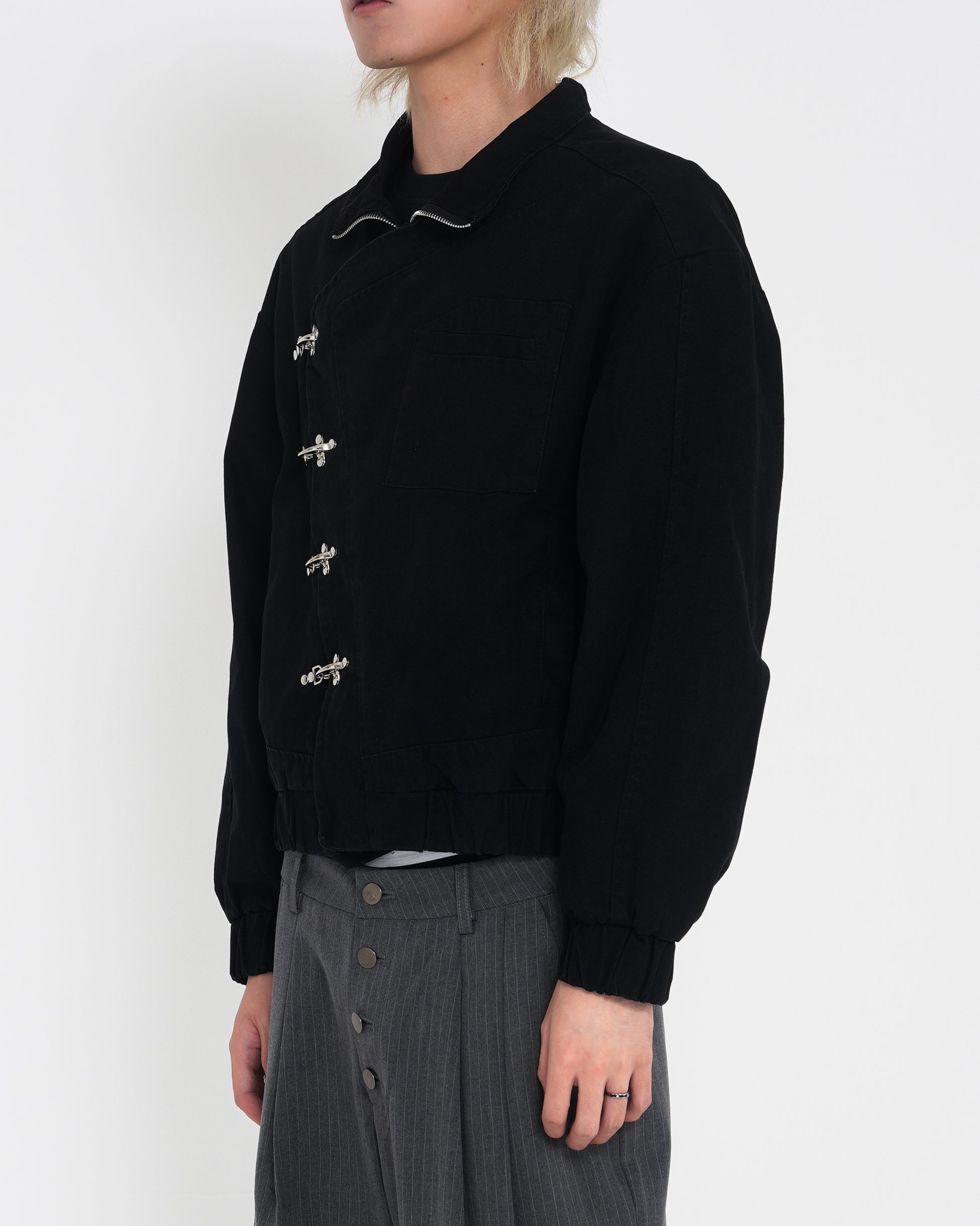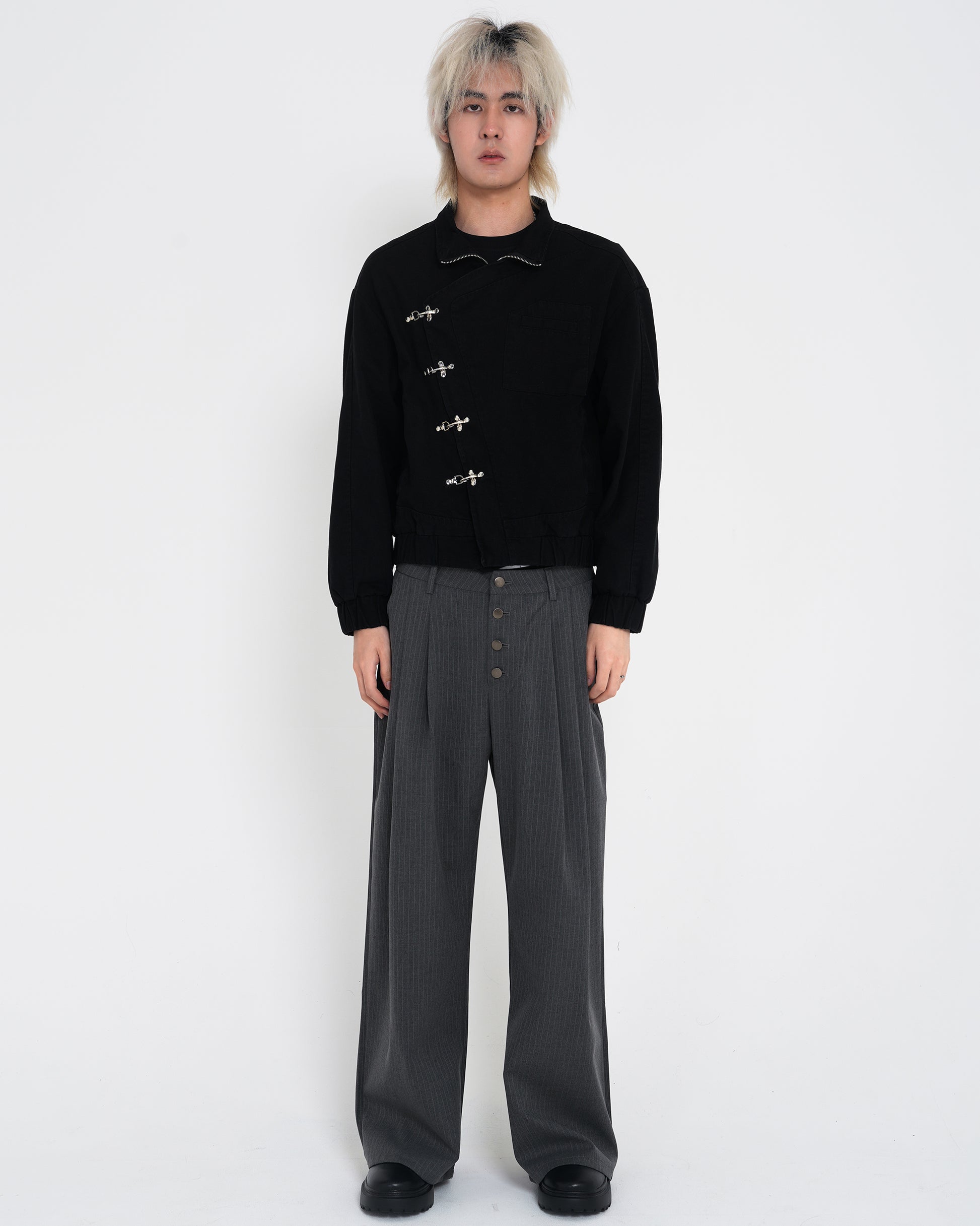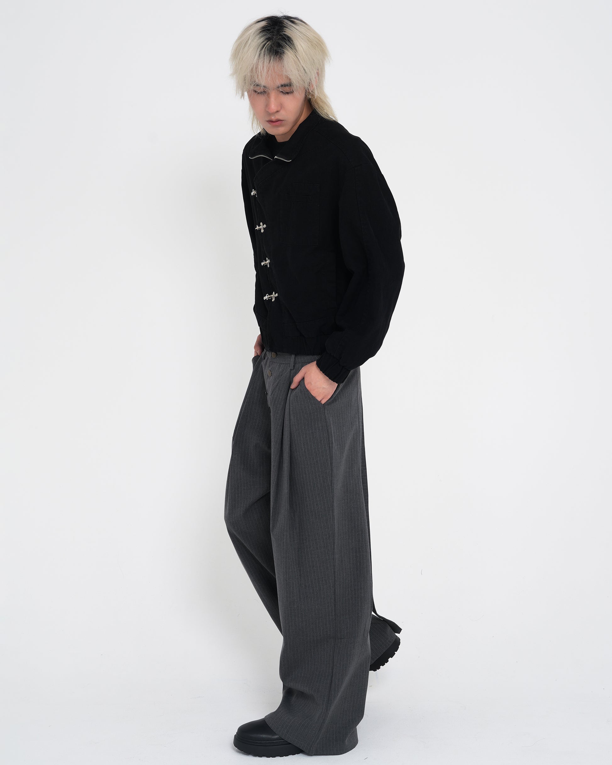 フロントの合わせが斜めまたは深めにクロスすることで、フックやトグルで留める際に立体感が生まれる。