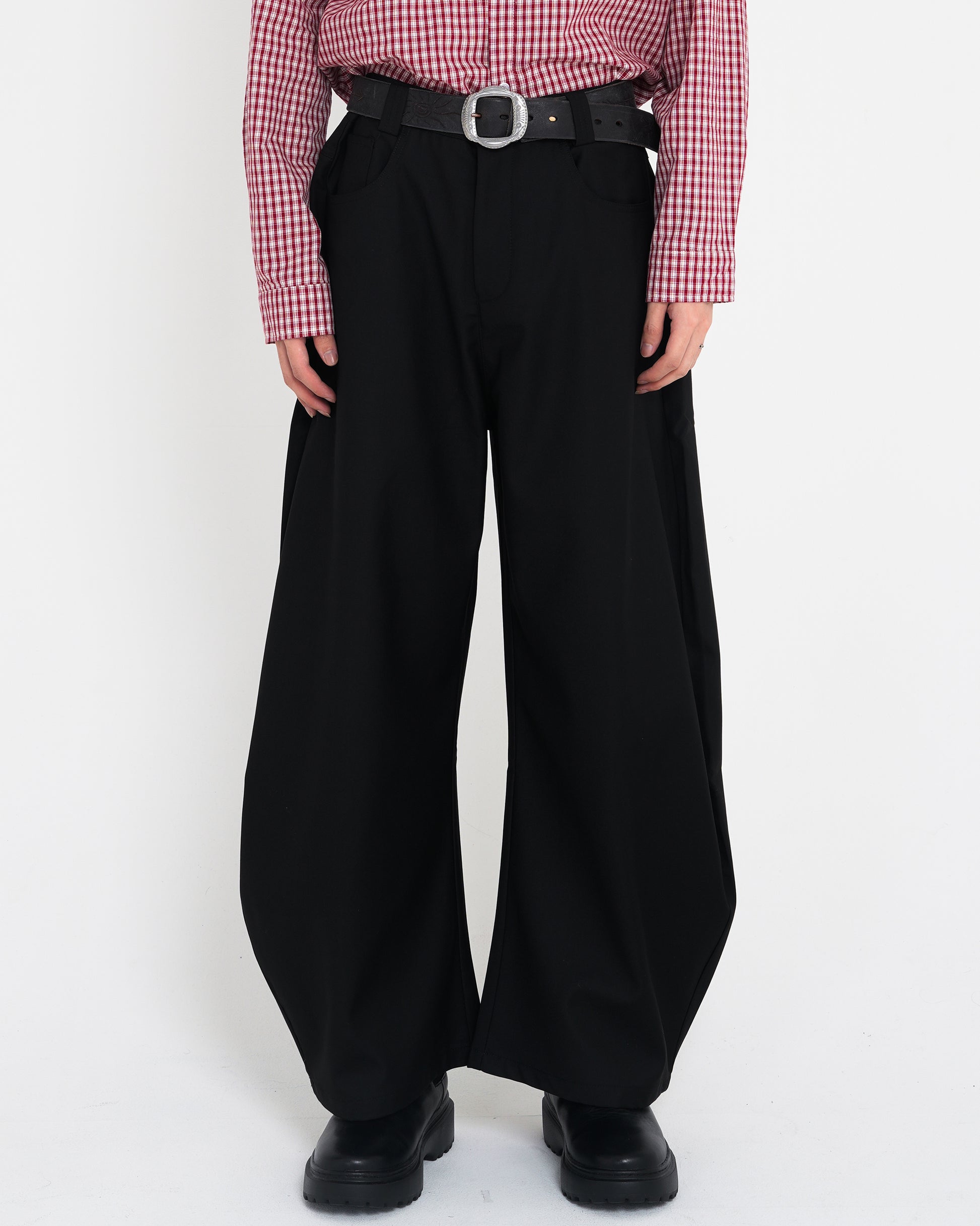 太ももから裾にかけて緩やかなカーブを描く立体パターンで、ワイドながらもルーズすぎず、モードな印象に。